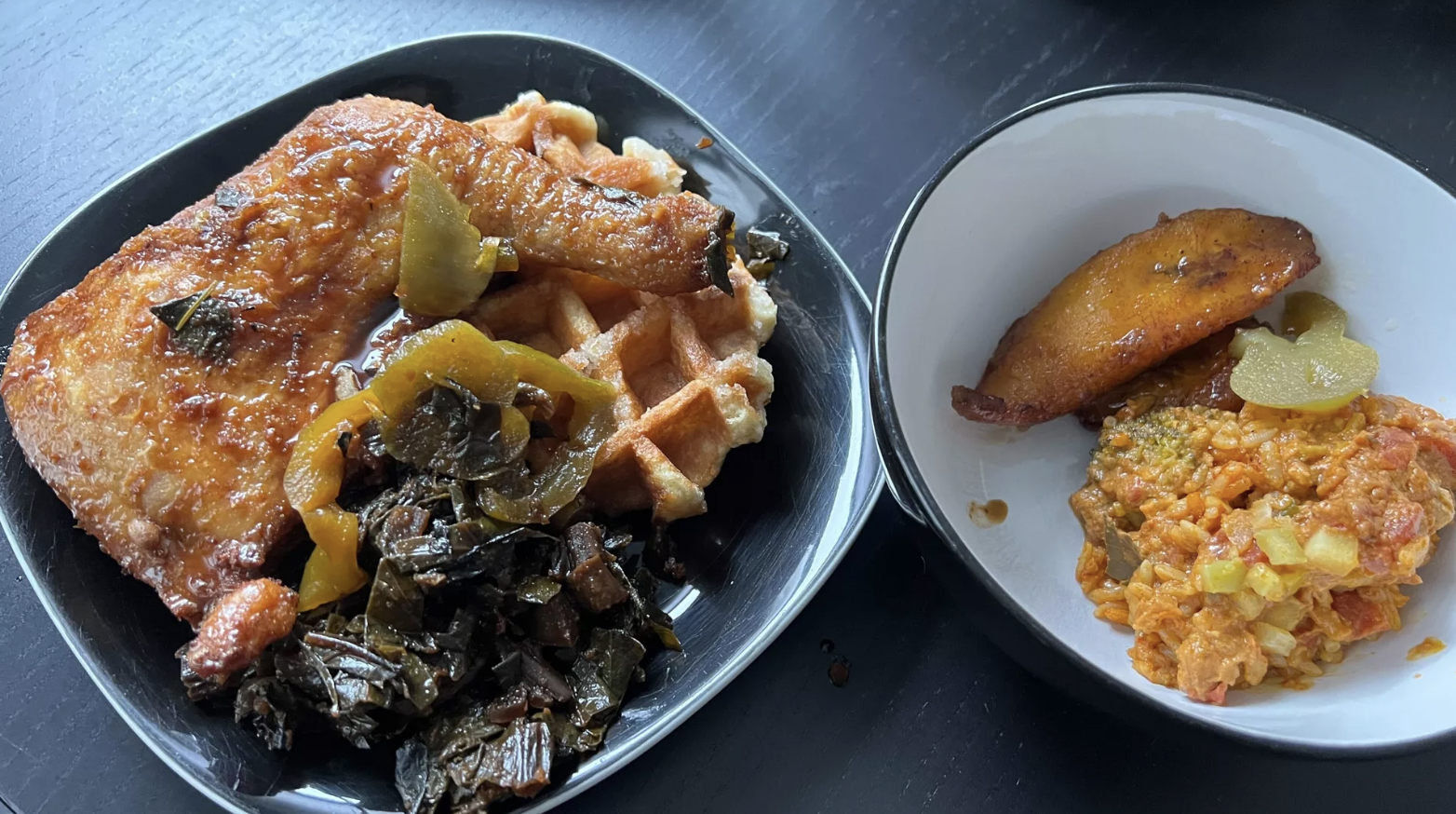 The Suya Chicken and Waffles dish at Yum Village in Detroit has smoky chicken that complements a sweet waffle, and is served with truffle oil-infused stewed greens that offers a balance of tender leaves and stems with a crunch in ever bite.